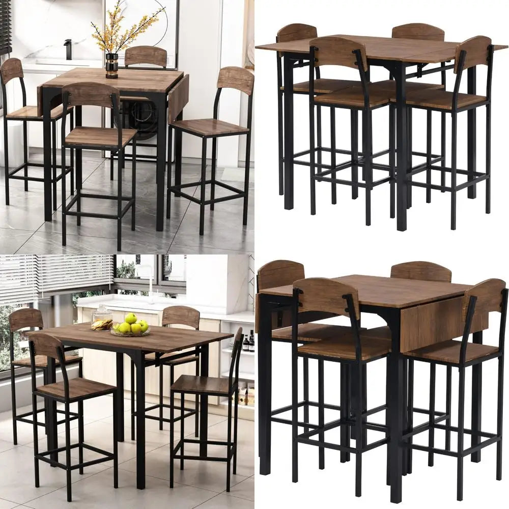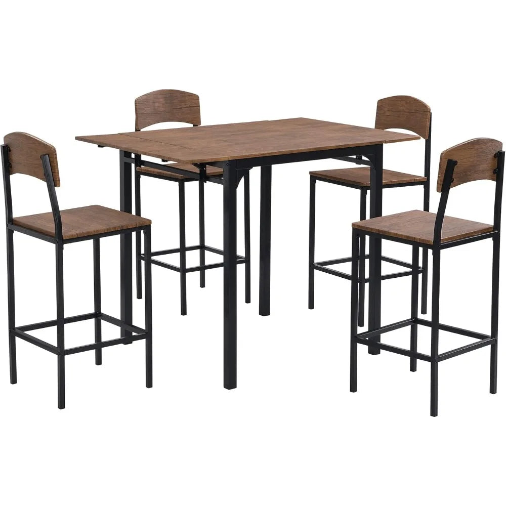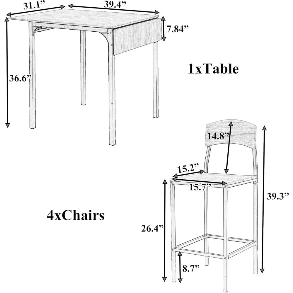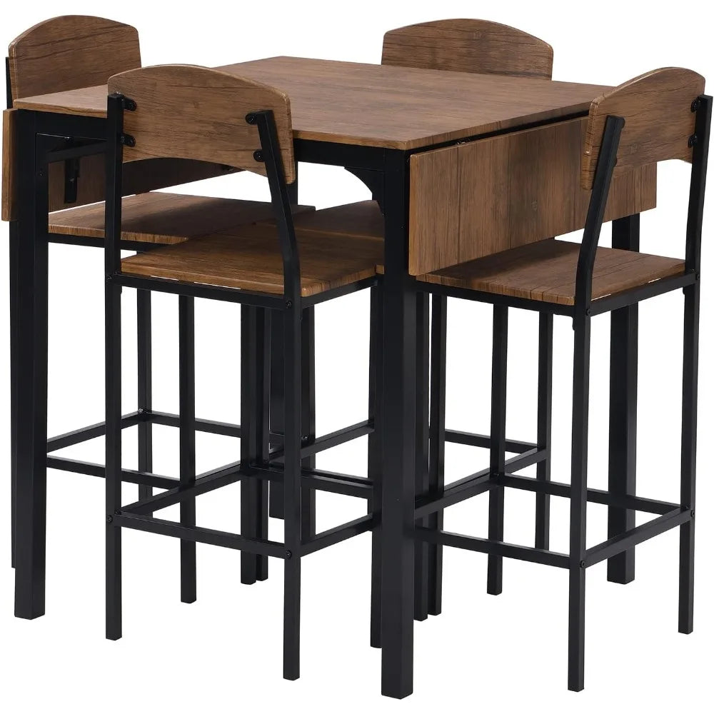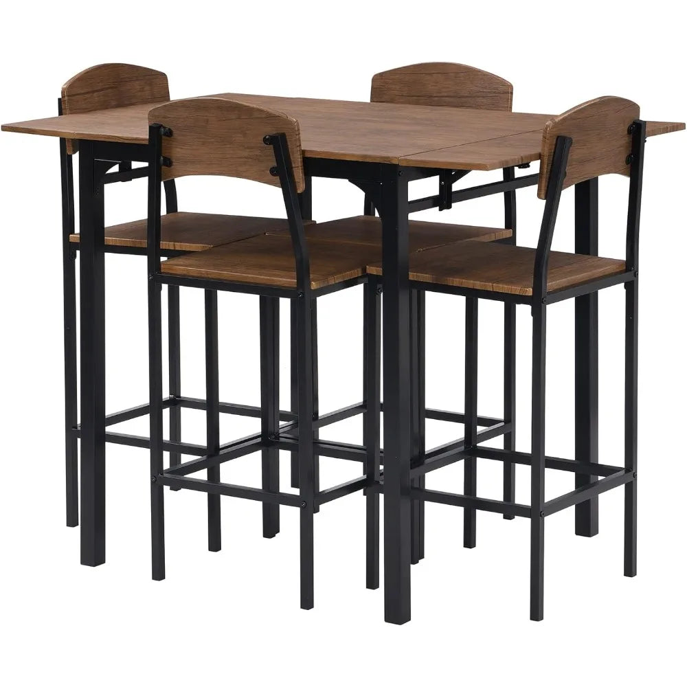 5-Piece High Counter Dining Set with Bar Table and Farmhouse-Style Drop Leaf Table, Accompanied by 4 Comfortable Counter Height