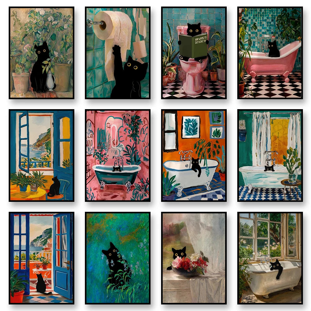 Bathroom Cat Reading on Toilet Canvas Wall Art Print Poster β Funny Animal Decor Painting, Home Decor Gift (Unframed