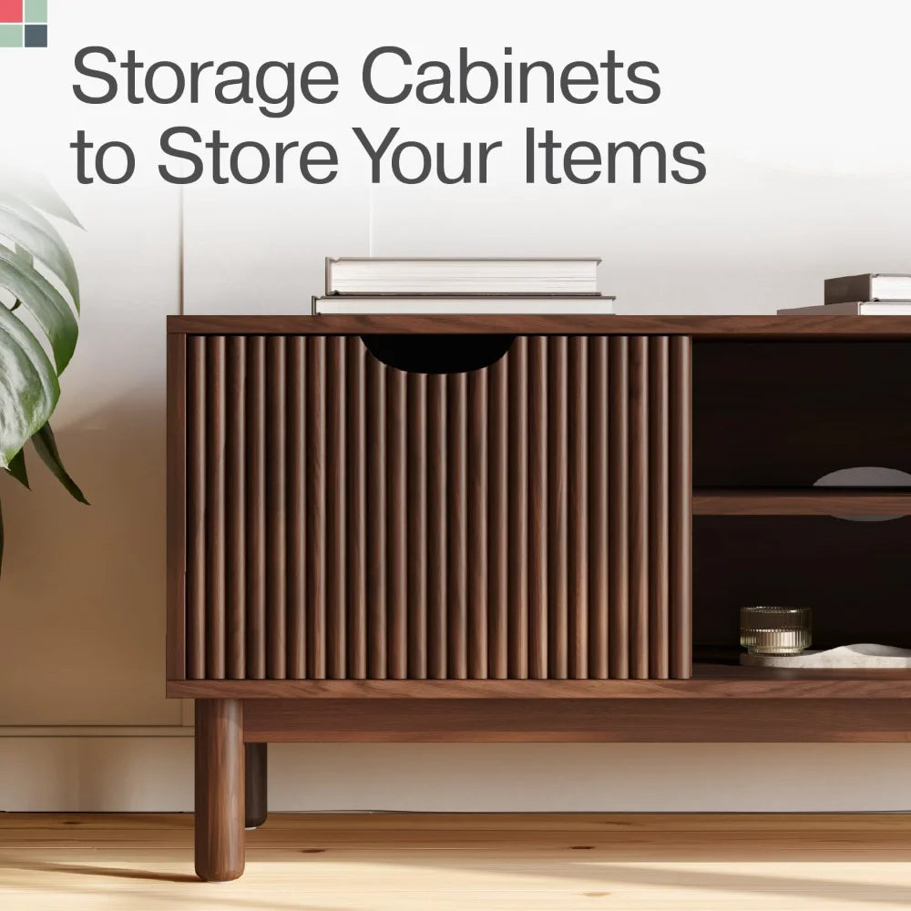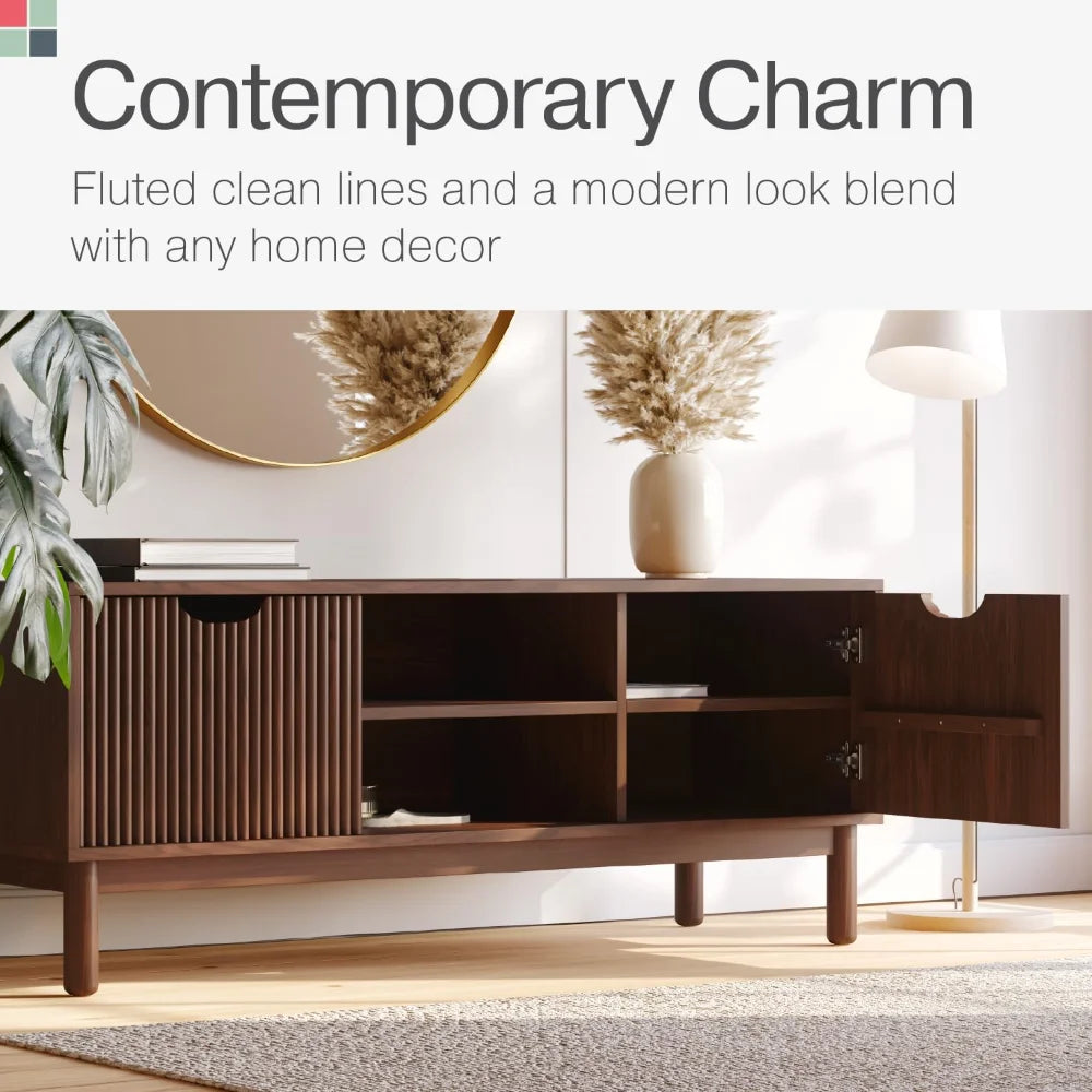 Low Profile Fluted TV Stand - Mid Century Media Console - Living Room Furniture - 48” Entertainment Center with Shelves & Doors